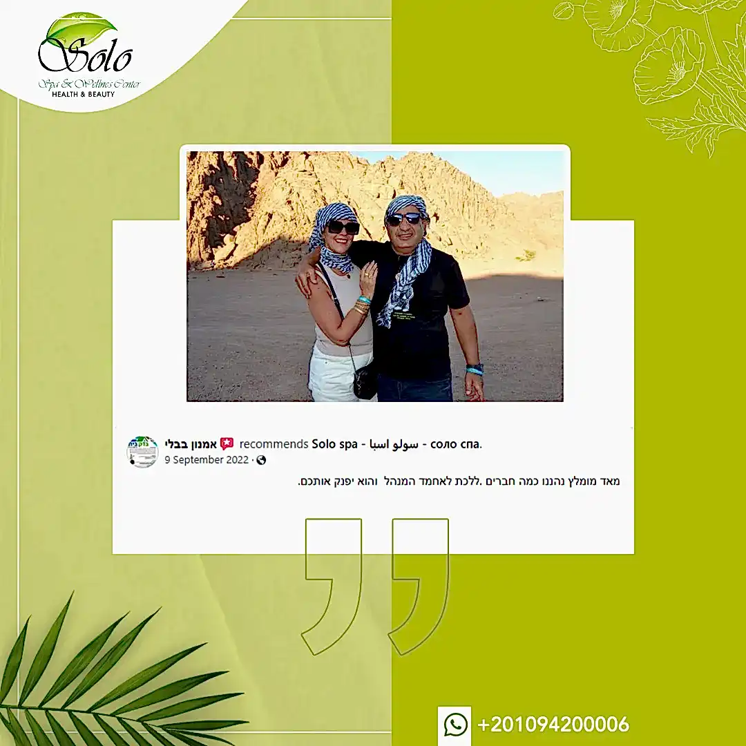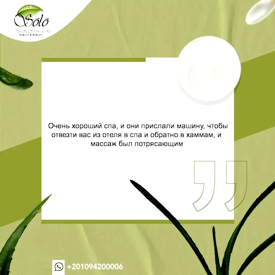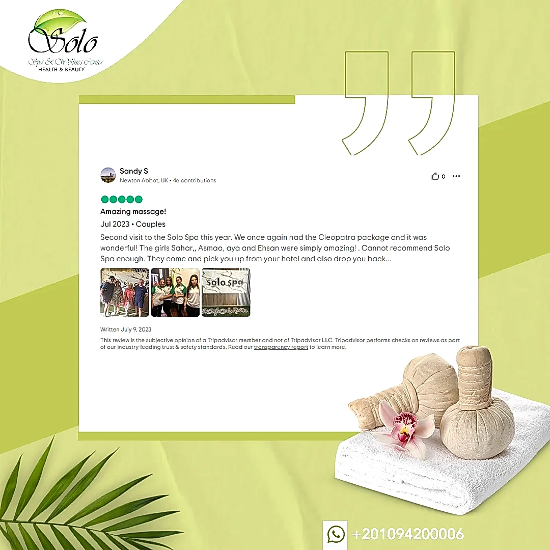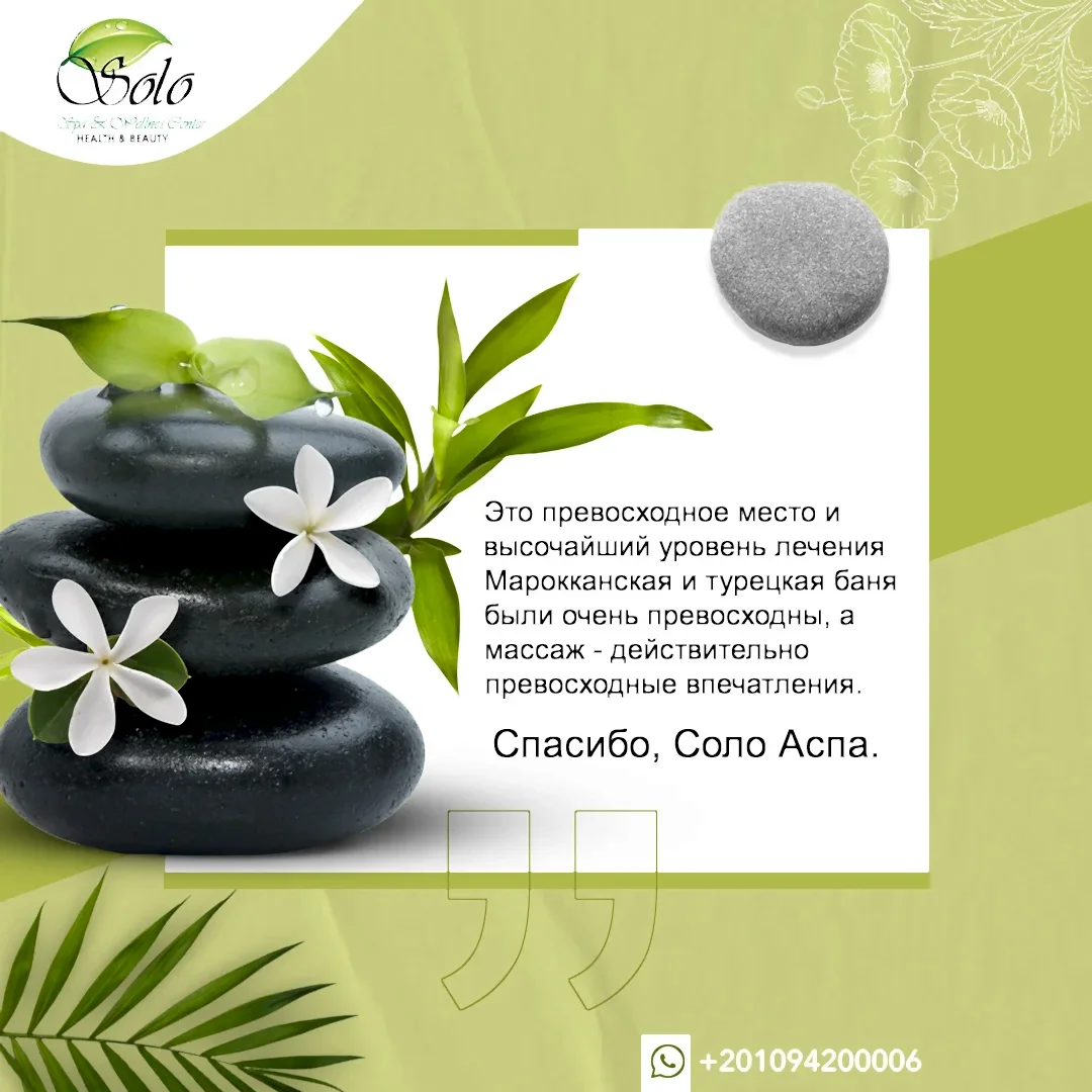 At Solo SPA, we don’t just offer a service—we provide a unique experience marked by quality and comfort. We use the latest techniques in body care and therapy, while offering extra amenities like free transportation to enhance your relaxation journey. Plus, we provide exclusive discounts on trips inside and outside Egypt, catering to everyone from athletes to those seeking rest and rejuvenation, with a wide range of treatments including various types of massages.