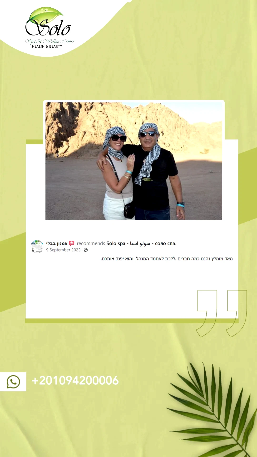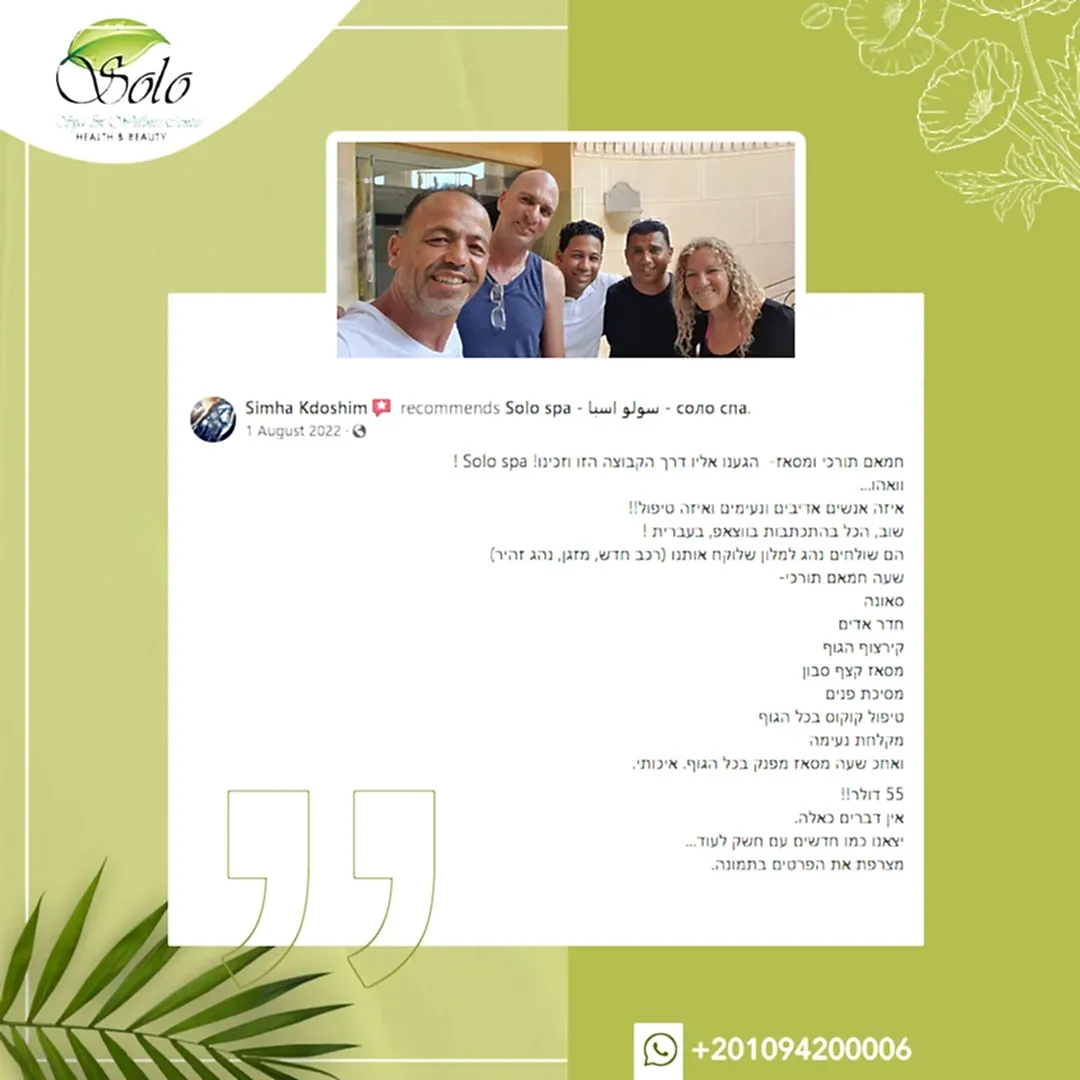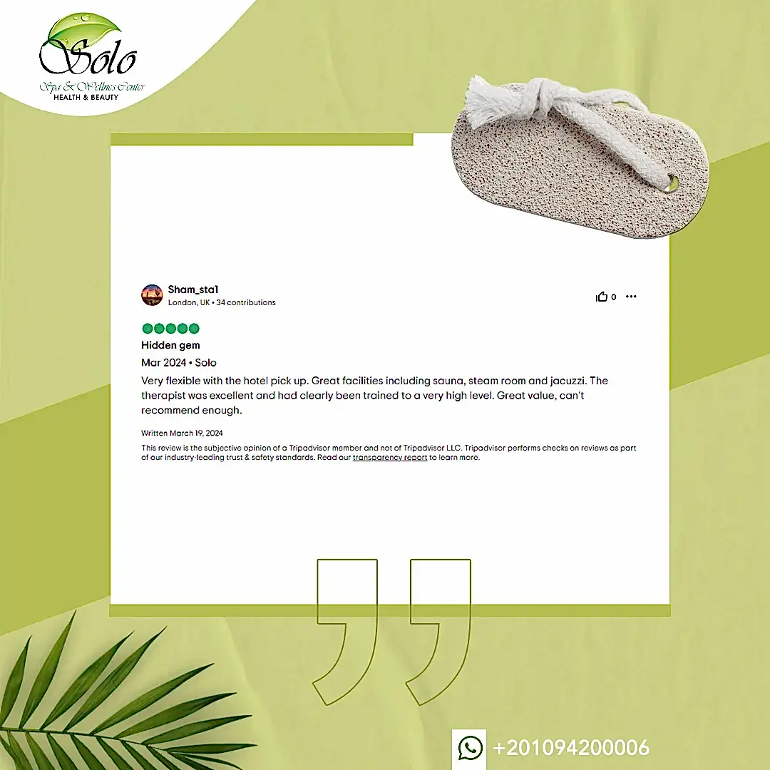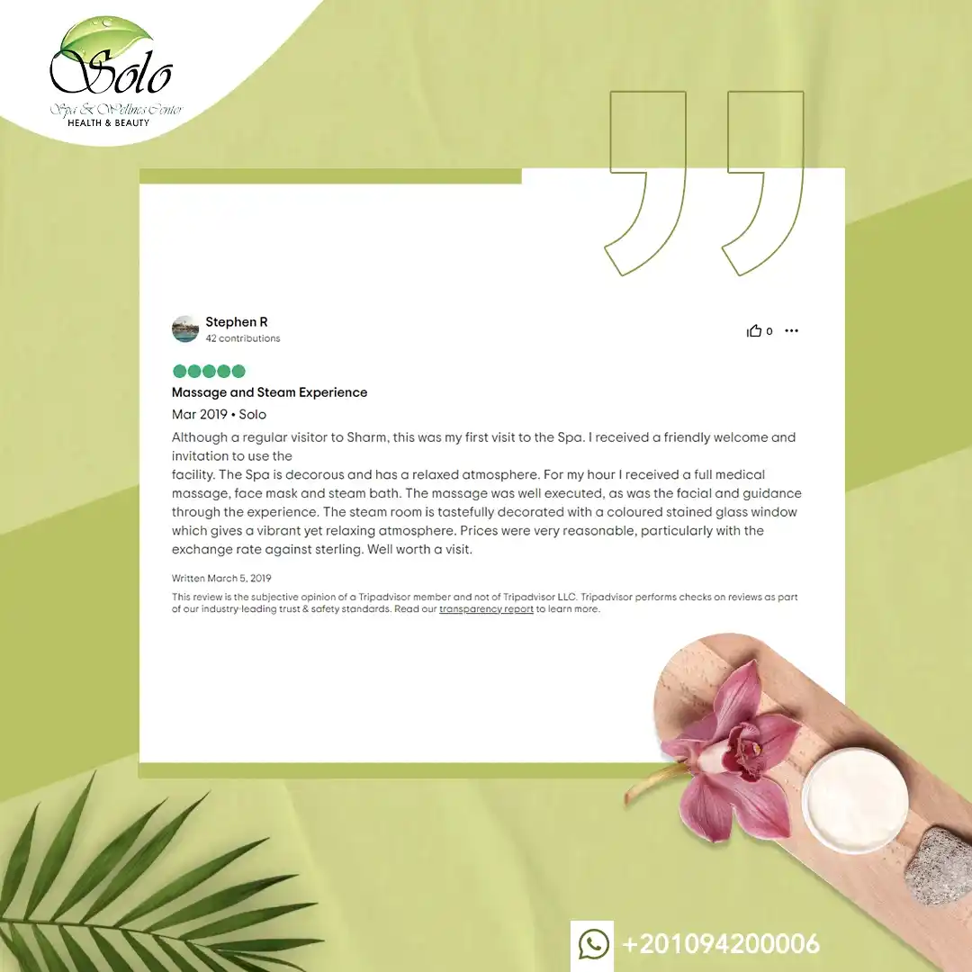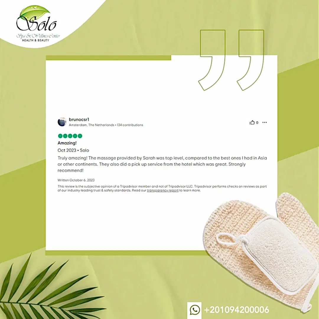 At Solo SPA, we don’t just offer a service—we provide a unique experience marked by quality and comfort. We use the latest techniques in body care and therapy, while offering extra amenities like free transportation to enhance your relaxation journey. Plus, we provide exclusive discounts on trips inside and outside Egypt, catering to everyone from athletes to those seeking rest and rejuvenation, with a wide range of treatments including various types of massages.
