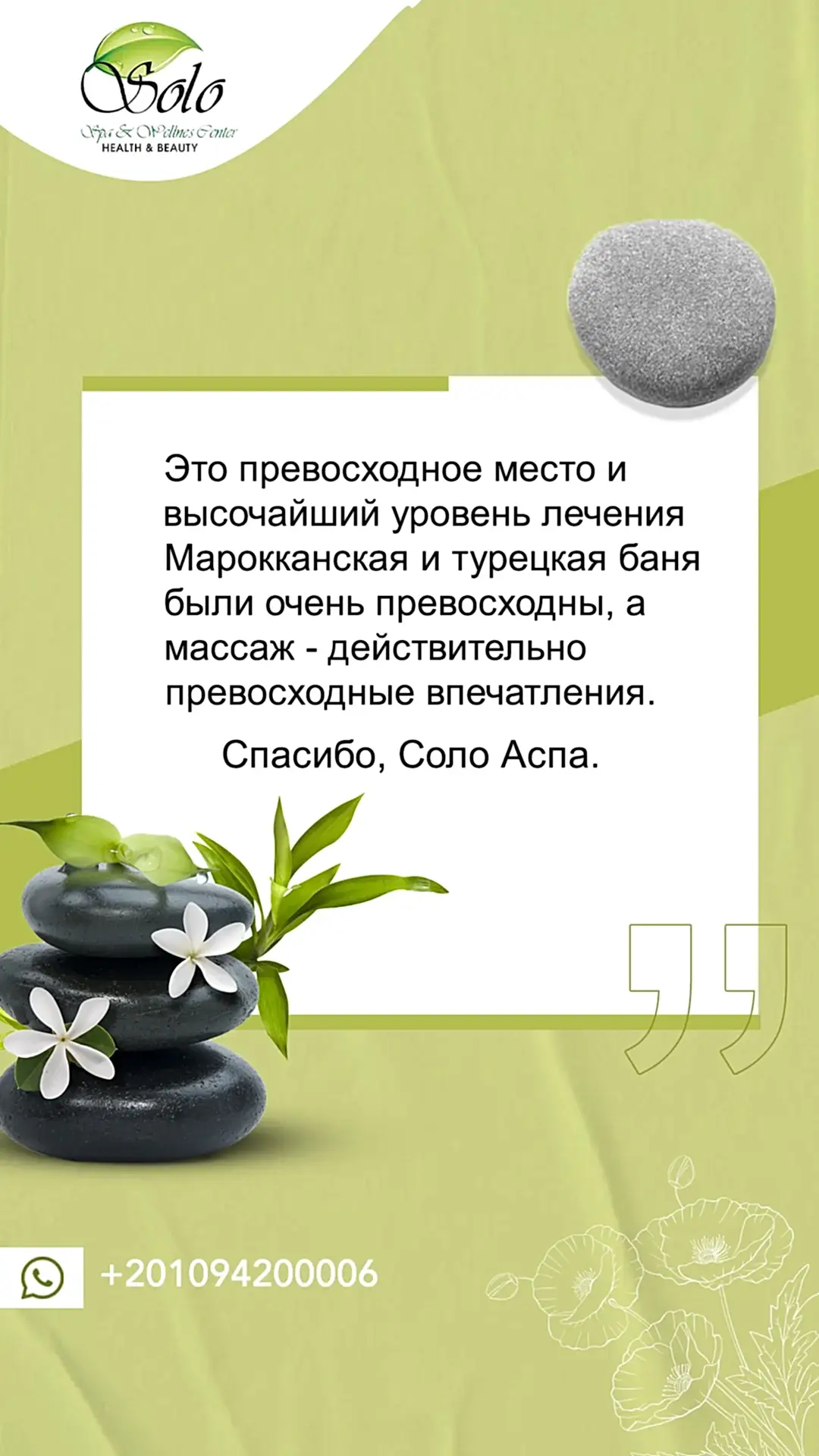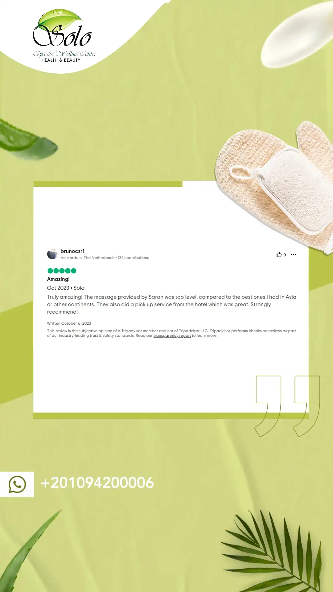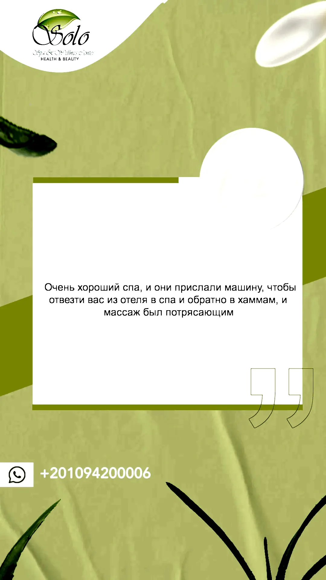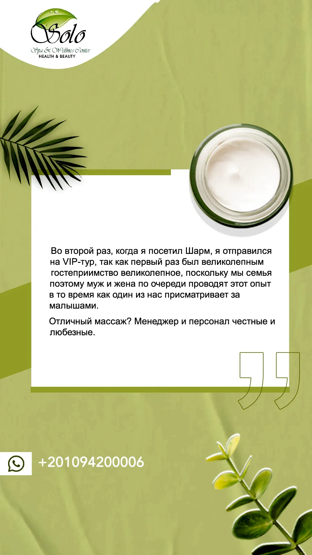 At Solo SPA, we don’t just offer a service—we provide a unique experience marked by quality and comfort. We use the latest techniques in body care and therapy, while offering extra amenities like free transportation to enhance your relaxation journey. Plus, we provide exclusive discounts on trips inside and outside Egypt, catering to everyone from athletes to those seeking rest and rejuvenation, with a wide range of treatments including various types of massages.