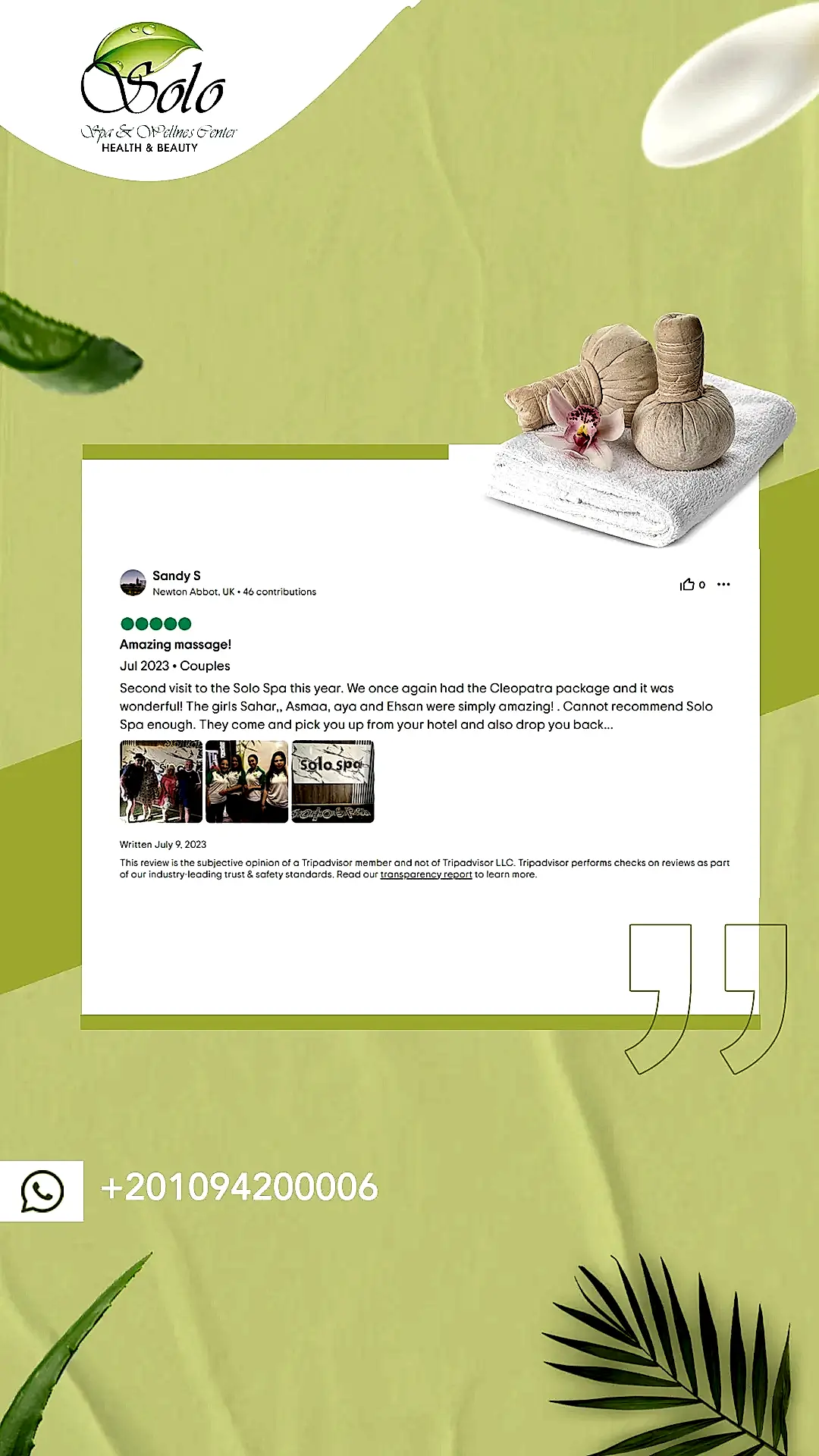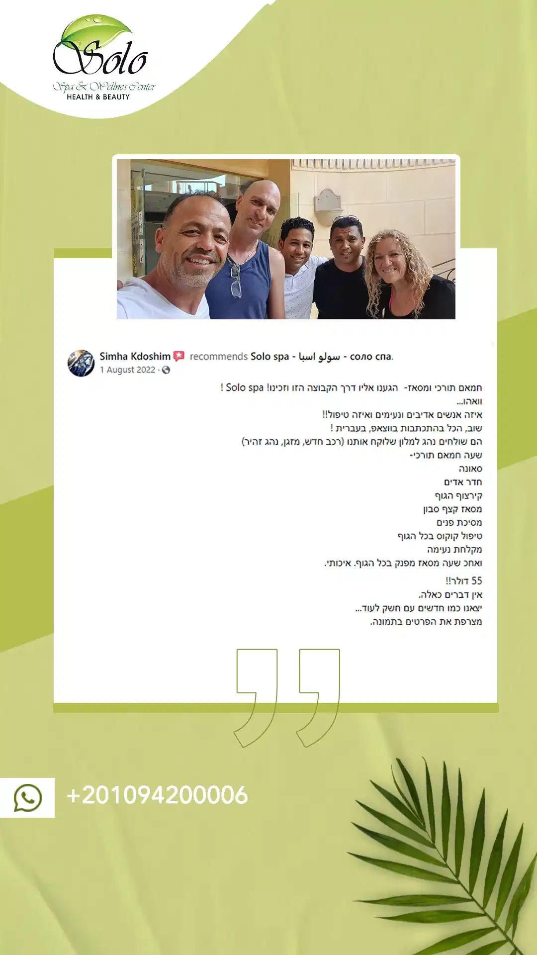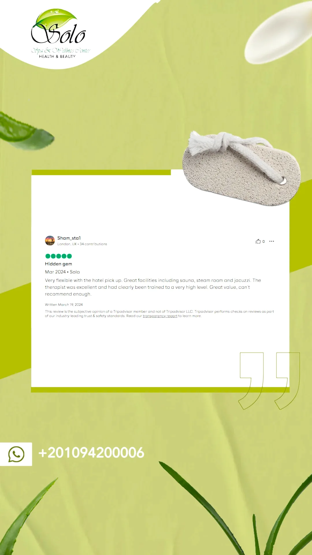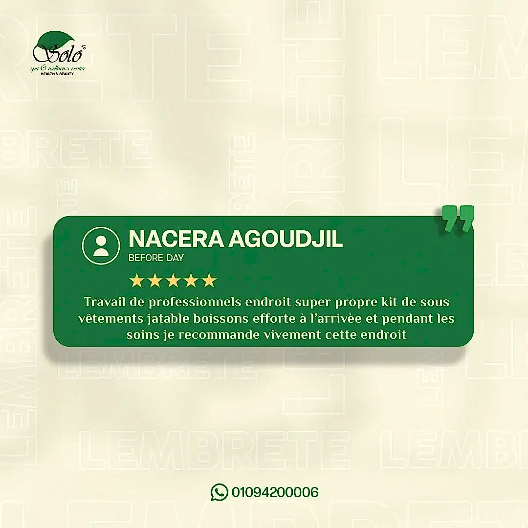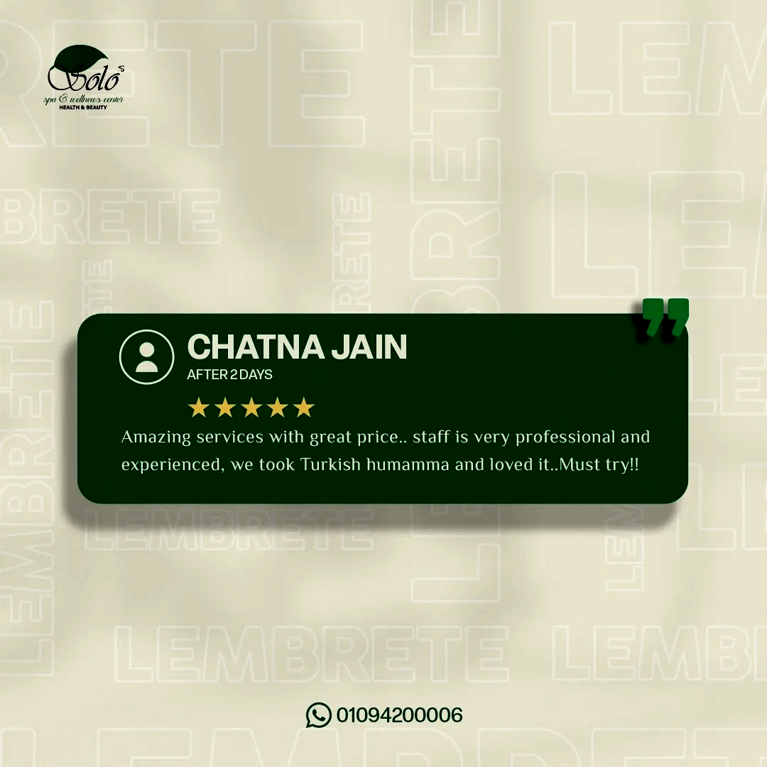 At Solo SPA, we don’t just offer a service—we provide a unique experience marked by quality and comfort. We use the latest techniques in body care and therapy, while offering extra amenities like free transportation to enhance your relaxation journey. Plus, we provide exclusive discounts on trips inside and outside Egypt, catering to everyone from athletes to those seeking rest and rejuvenation, with a wide range of treatments including various types of massages.
