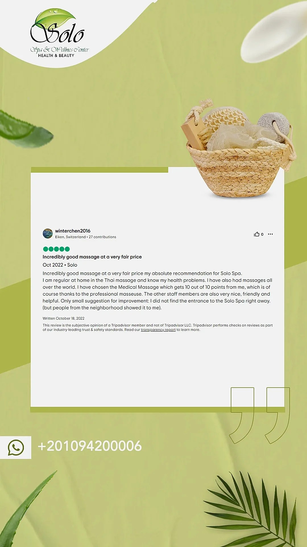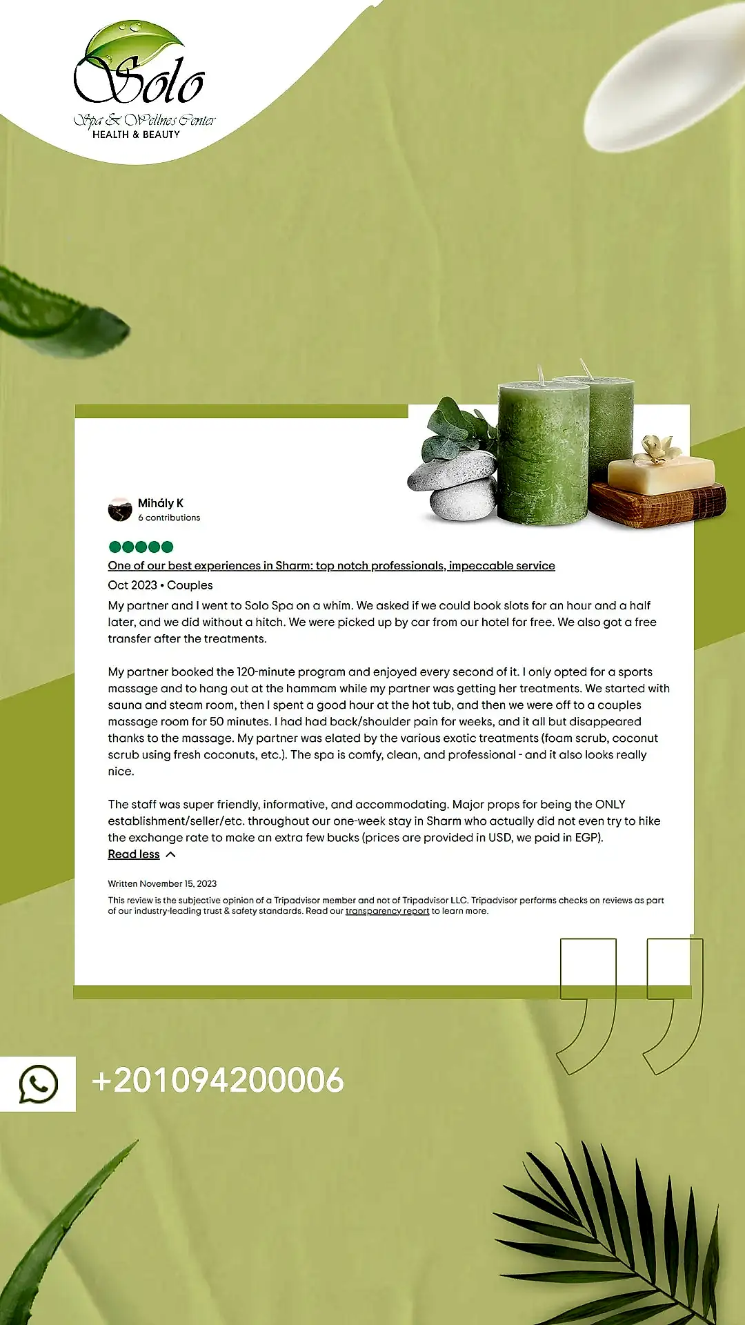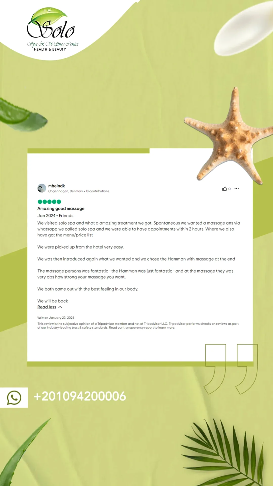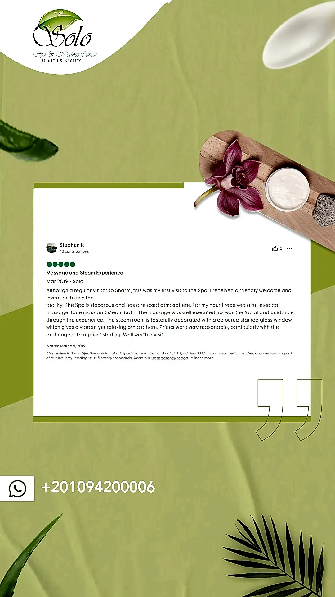 At Solo SPA, we don’t just offer a service—we provide a unique experience marked by quality and comfort. We use the latest techniques in body care and therapy, while offering extra amenities like free transportation to enhance your relaxation journey. Plus, we provide exclusive discounts on trips inside and outside Egypt, catering to everyone from athletes to those seeking rest and rejuvenation, with a wide range of treatments including various types of massages.